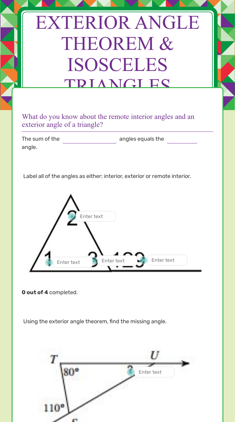The one page worksheet contains one question. Exterior angle theorem math exterior angle theorem worksheet. Write the exterior angle theorem as it applies to this triangle. This is a coloring activity for a set of 12 problems on the exterior angle sum theorem. You can choose a single variable or an algebraic expression for the unknown angle.